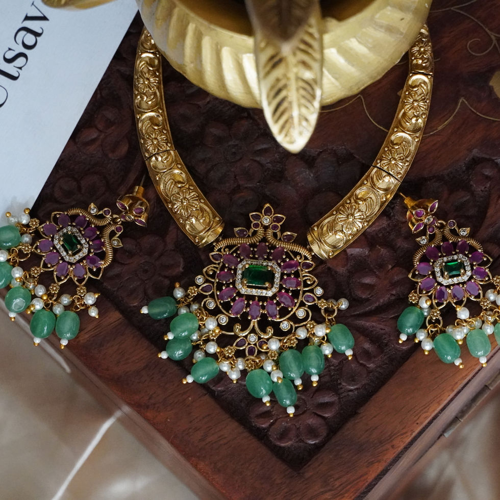 This exquisite choker features a bold, vintage-inspired design, highlighted by ruby-like stones and intricate gold detailing.