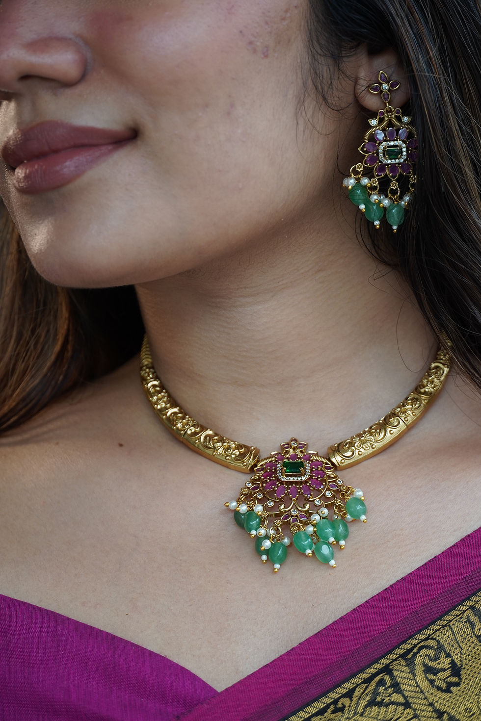 A traditional chain adorned with elegant pearls and paisley-shaped pendants embellished with sparkling stones and ruby-colored accents. Perfect for festive and ethnic wear, combining classic charm with refined detailing.